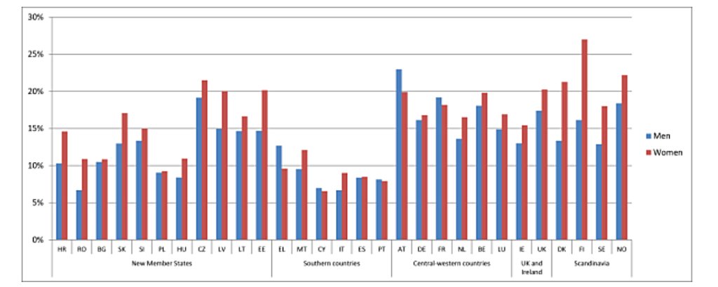 On voit que la proportion de femmes européennes sujettes (15,1 %) à ce problème est plus forte que celle des hommes (13,3 %) dans la plupart des pays d’Europe, avec un écart plus important dans certains pays scandinaves et baltes. Le graphique montre aussi le plus faible taux, hommes ou femmes, des pays du sud : moindres exigences productives ? moindre prise de conscience ?