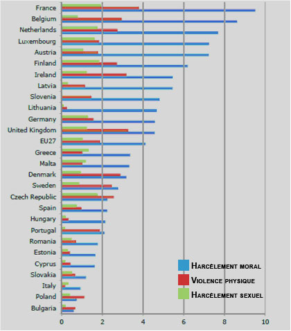 Il s’agit certes d’une mesure sur base déclarative, tirée de réponses à une enquête auprès des salariés, dont les résultats peuvent être influencés par la forte sensibilité aux questions de harcèlement et troubles psychosociaux dans notre pays (voir les campagnes médiatiques de 2010 et 2011).