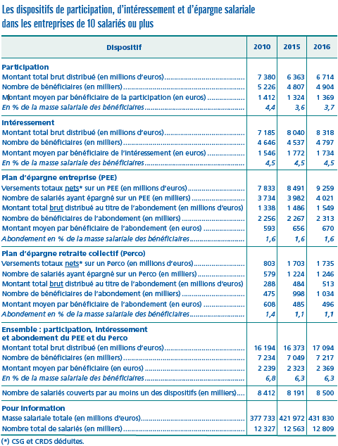 - Dares résultats – août 2018 N° 040 – Participation, intéressement et épargne salariale en 2016. Les sommes distribuées progressent pour la troisième année consécutive :